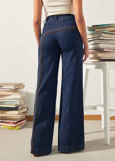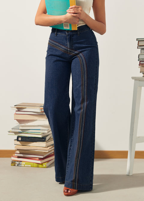 Ponořte se do 70. let s těmito džínami ModCloth! Džíny s duhovými vzory mají klasický vysoký pas a široký strih nohavic. Tmavě modrý odstín je vyroben z nízkopružné denimové směsi 70 % bavlny, 28 % polyesteru a 2 % spandexu. Náš denim (9,5 oz po vyprání) je záměrně lehký, aby vytvořil charakteristický zvonový střih, který splývá a splývá.Polyester dodává pevnost a tvar, což je standardem pro prémiový denim. Zapínání na zip a knoflíky dodává moderní nádech. Výšivka Roy G Biv se táhne od přední do zadní strany a dodává džínům jedinečný šmrnc.