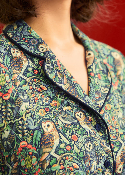 Der Allover-Print mit Eulen, Vögeln und Waldmotiven versprüht einen Vintage-Naturalismus-Charme – gleichermaßen elegant und verspielt. Das Kleid aus atmungsaktiver 100% Baumwolle mit Kragen, Knopfleiste und passendem Gürtel schmeichelt der Figur und bietet ganztägigen Tragekomfort. Ein Look, der „Teestunde mit dem Professor“ oder „Eulenbeobachtung in der Dämmerung“ schreit.