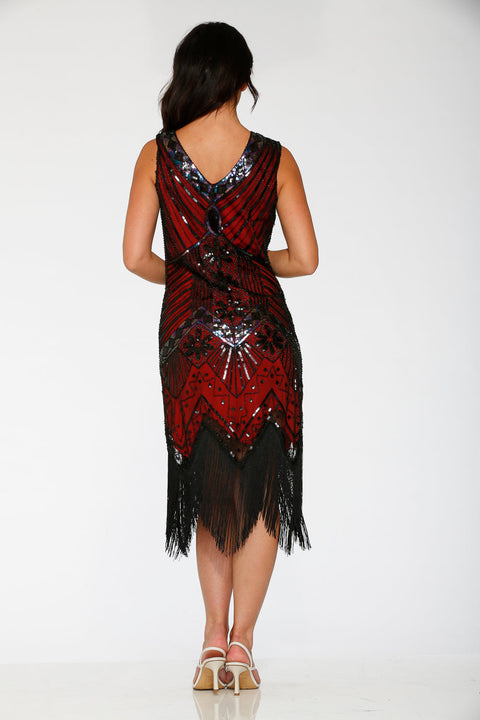 Tauchen Sie ein in die goldenen Zwanziger mit dem schwarz-roten Flapper-Kleid „Orchid Bloom“. Aufwendige Perlenstickereien, funkelnde Pailletten und Fransen verleihen diesem Kleid echten Vintage-Glamour. Perfekt für Mottopartys, Cocktailabende oder festliche Anlässe – ein Statement-Piece, das ebenso schick wie verspielt ist.