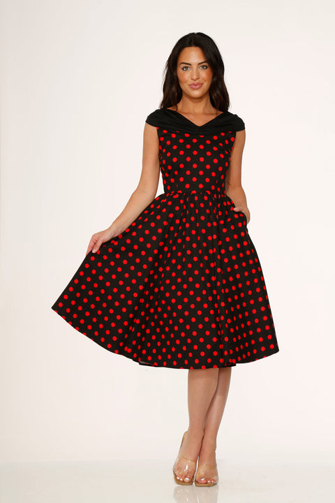 Das schwarz-rote Polka-Dot-Swingkleid von Orchid Bloom ist kühn und verspielt zugleich und verleiht jeder Garderobe einen Hauch von Retro-Flair. Die leuchtend roten Punkte tanzen auf klassischem Schwarz und machen diese schwingende Silhouette perfekt für Vintage-Liebhaberinnen und alle, die ein modisches Statement setzen möchten. Das Kleid ist aus einem weichen Baumwoll-Elasthan-Gemisch gefertigt und bietet genau die richtige Dehnbarkeit für eine schmeichelhafte und bequeme Passform. Mit einem Reißverschluss hinten in der Mitte und praktischen Seitentaschen ist dieses Kleidungsstück ein echter Hingucker und gleichzeitig sehr bequem.