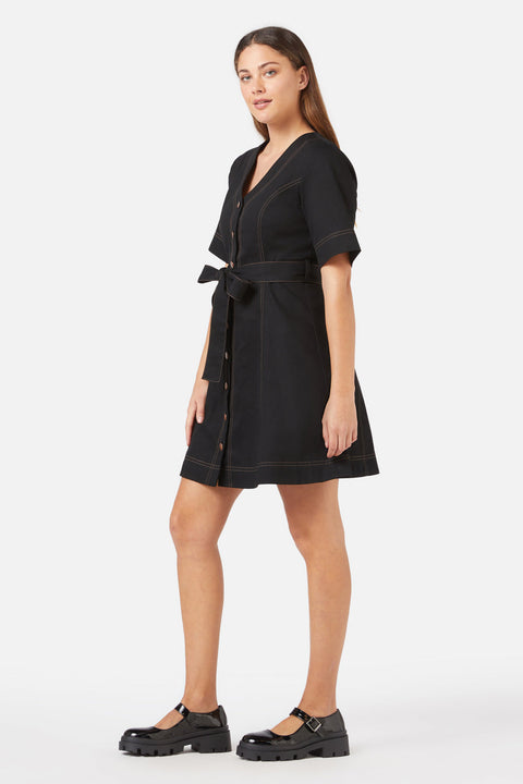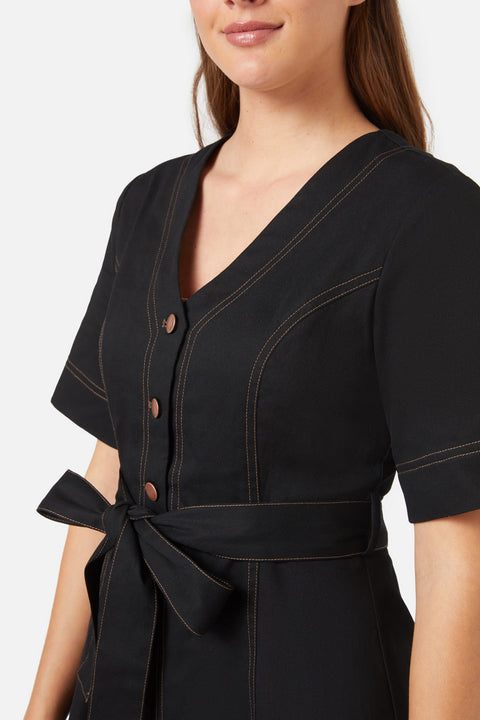Tiana Minikleid von Princess Highway: Mit dem Tiana Minikleid aus schwarzem Denim vereinen Sie lässige Eleganz. Dieses Minikleid im A-Linien-Stil ist aus strapazierfähigem Baumwolltwill gefertigt und bietet so optimalen Tragekomfort für jeden Tag. Es besticht durch einen V-Ausschnitt, eine durchgehende Knopfleiste und schmeichelhafte kurze Ärmel. Kontrastierende Ziernähte in Beige und ein abnehmbarer Taillengürtel verleihen ihm einen Hauch von Retro-Charme. Ob für einen entspannten Tag oder einen Abend in der Stadt – dieses Kleid vereint Komfort und Stil auf perfekte Weise.