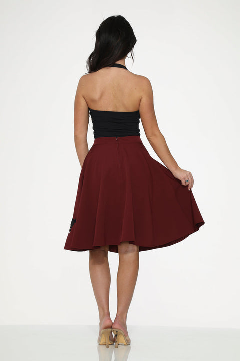 Otočte hlavy a zatočte se s elegancemi v vínově červené vyšívané sukni s motivem pudla Orchid Bloom! Díky sytě vínovému odstínu a klasické černé nášivce s motivem pudla je tato sukně čistým vintage šarmem s výrazným nádechem. Volánková silueta a pohodlná strečová směs ji činí ideální na procházky za měsíčního svitu, retro tance nebo prostě na to, abyste si z každého chodníku udělali molo.
