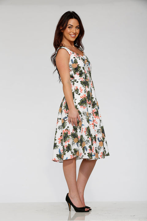 Sag Aloha zum sonnigen Stil mit dem weißen Hawaii-Swingkleid von Orchid Bloom! Mit seinem üppigen tropischen Print aus Ananas und leuchtenden Blumen auf strahlend weißem Grund ist dieses Kleid im Retro-Stil wie geschaffen für Urlaub, Gartenpartys und schwungvolle Stunden in der warmen Brise. Der herzförmige Ausschnitt und der schmeichelhafte Swingrock verleihen zeitlosen Charme, während die weiche Baumwoll-Elasthan-Mischung für ganztägigen Tragekomfort sorgt.