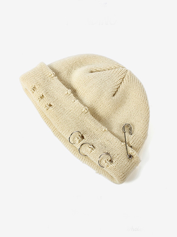 Safety Pin Distressed Knitted Beanie Hat