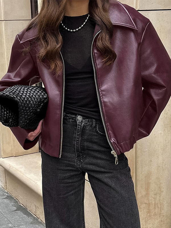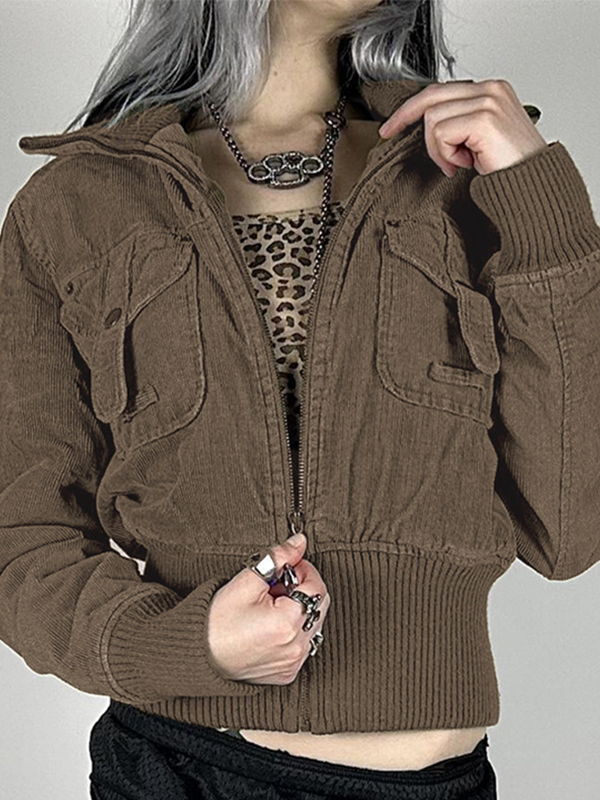 Vintage Brown Lapel Neck Zip Up Short Jacket