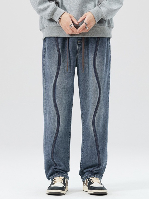 Men’s Vintage Top-stitching Drawstring Loose Jeans