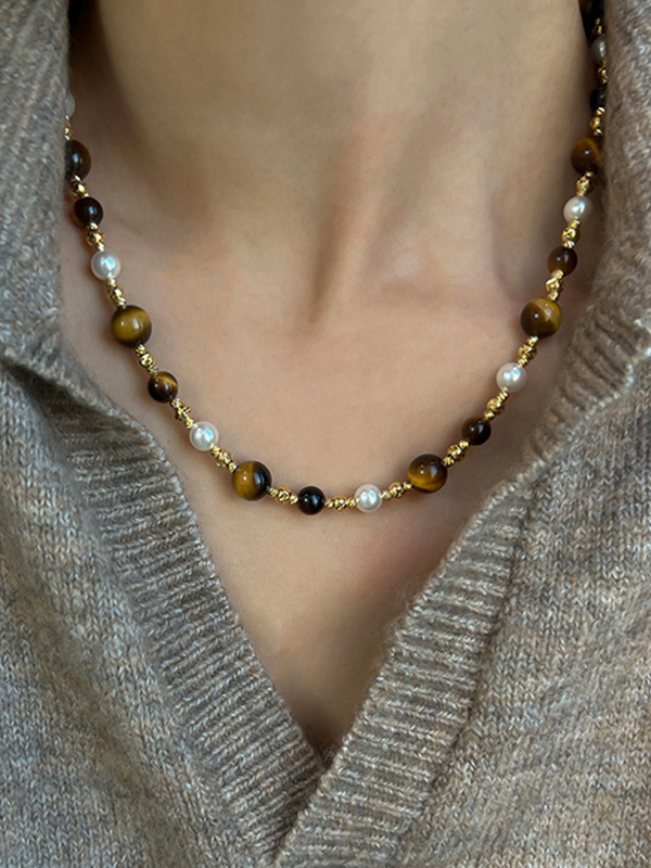 Tiger Eye Stone Pearl Connected Necklace