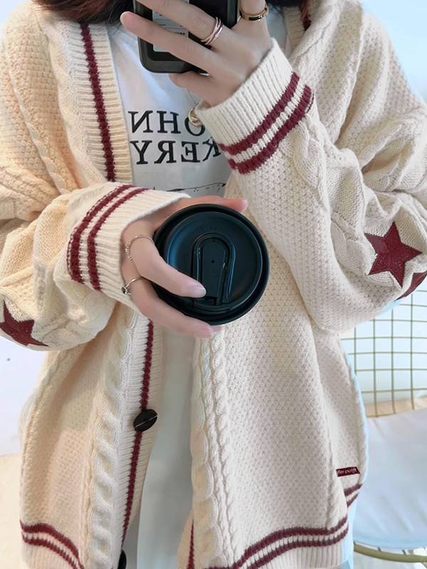 Description: Star things may add some fun to your winter outfits. These cosy knitwears cut to a super flattering silhouette, features star embroidered, contrast striped detail and drop shoulders design, ended with button fasten to the front.