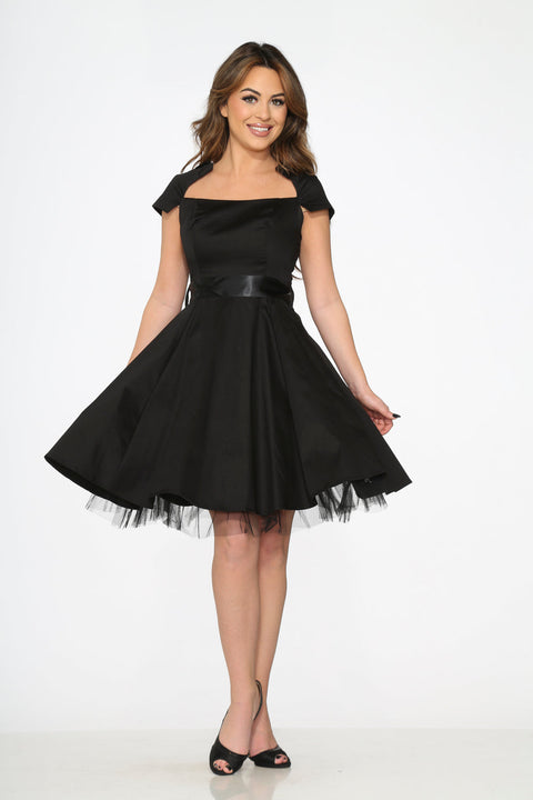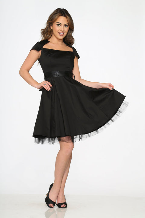 Das schwarze Swingkleid „Orchid Bloom“ vereint Eleganz und zeitlosen Stil. Mit seinem klassischen eckigen Ausschnitt und den kurzen Ärmeln verleiht es jedem Anlass einen Hauch von Vintage. Die schwingende Silhouette schmeichelt jeder Figur, während der elegante Taillenbund für einen Hauch von Raffinesse sorgt. Gefertigt aus einem Baumwoll-Elasthan-Gemisch, das für sanften Stretch und hohen Tragekomfort sorgt, verfügt es außerdem über einen seitlichen Reißverschluss für einfaches An- und Ausziehen sowie einen dezenten Tüllsaum für zusätzlichen Charme.
